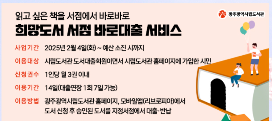 - 이용방법 : 광주광역시립도서관 홈페이지 또는 모바일앱(‘리브로피아’)에서 신청 후, 승인 및 희망도서 도착 문자 수신 시 해당 서점에서 대출·반납 ※ 무등도서관 정기 휴관일(매월 두 번째, 네 번째 월요일) 및 관공서 공휴일에 신청한 도서는 다음 날 승인처리됨