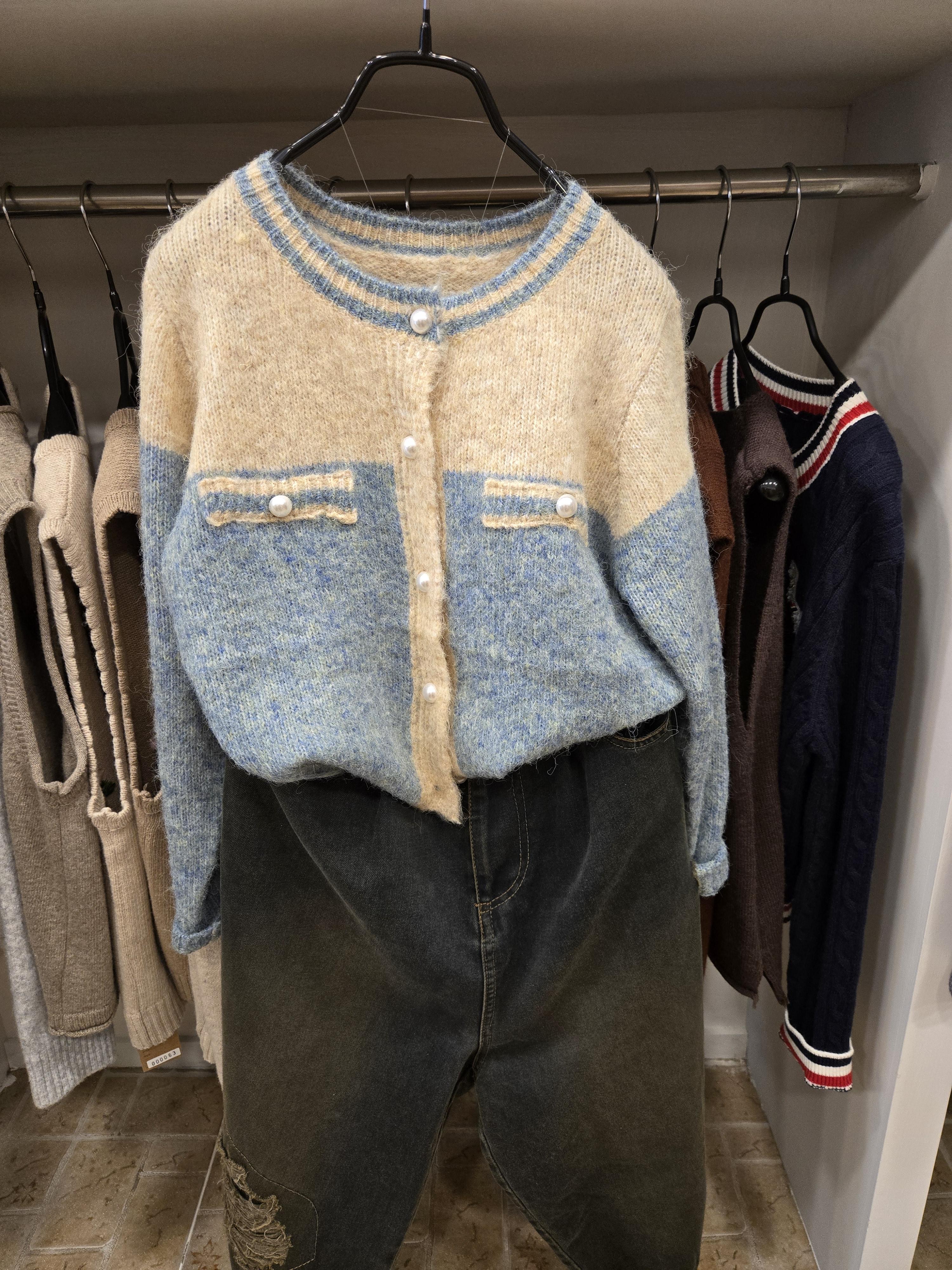 주말 다음 월요일은 누구나 왠지 더 피곤함을 느끼는 것 같아요. 월요병을 극복할 수 있는 상큼한 니트 가디건 모두 잘 어울릴 수 있는 하늘색과 아이보리로 되어있는 가디건에 고급스러워 보이는 진주 단추, 화가 나도 금방 풀릴 것 같은 차림새이죠. 월요일은 이런 스타일 어떤가요?